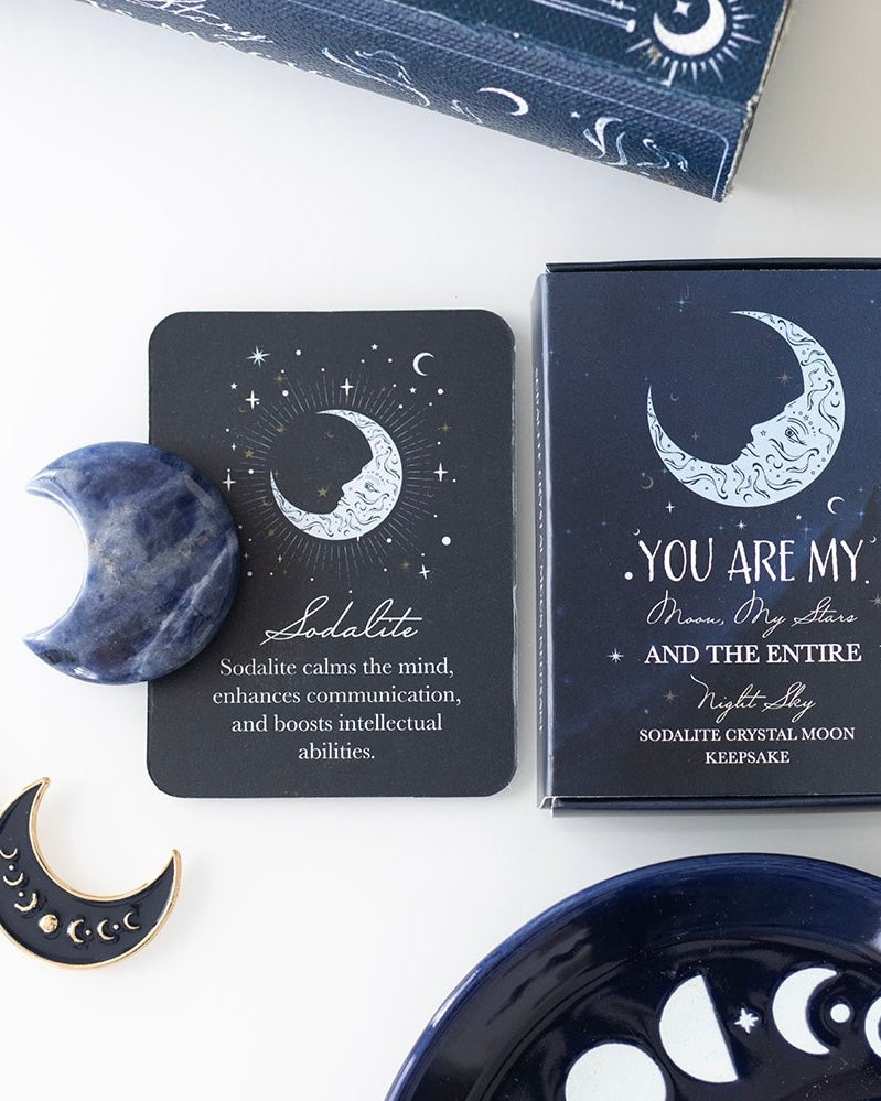 Una preciosa luna creciente tallada en sodalita, presentada en su cajita celestial a juego: el detalle perfecto para regalo o autoregalo. La sodalita es una piedra que potencia la intuición, la claridad mental y la conexión interna, ideal para meditaciones, rituales lunares o para llevar cerca en momentos de búsqueda y enfoque.