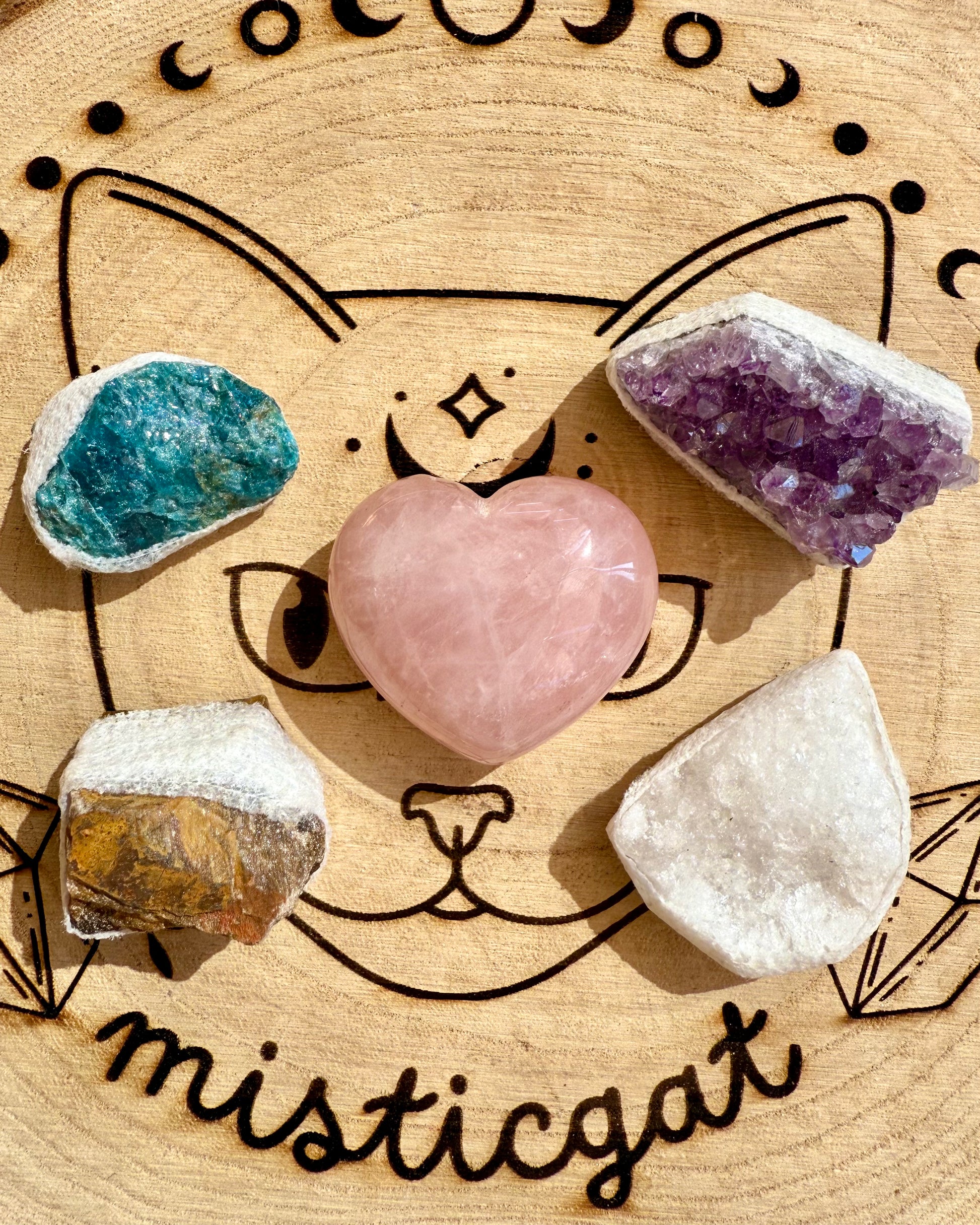 Contiene: Corazón de Cuarzo Rosa, Ojo de Tigre en bruto, Apatita en bruto, Geoda de Cuarzo, Drusa de Amatista.