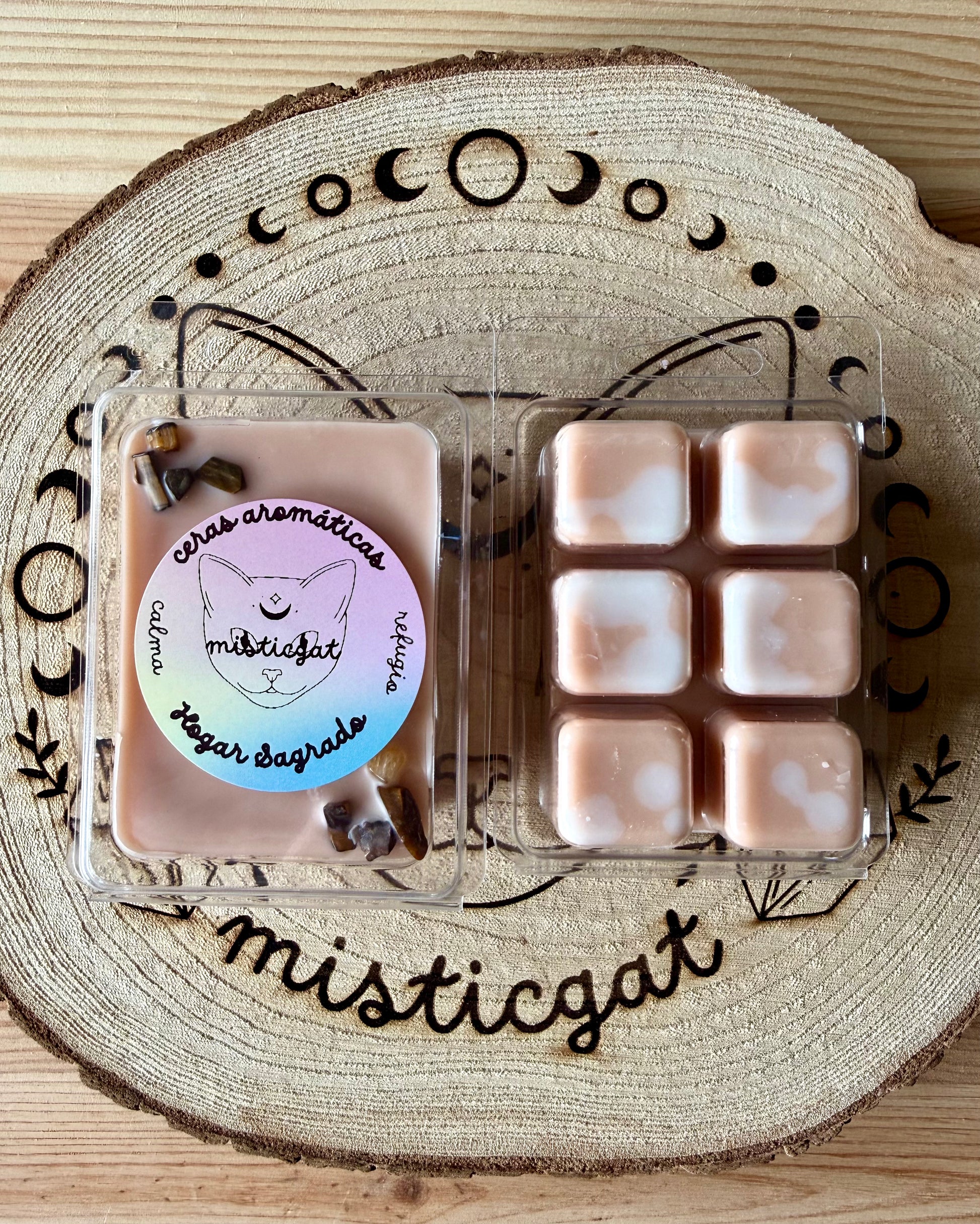 Estas ceras han sido creadas para envolverte en una energía de refugio, arraigo y serenidad. Su aroma evoca la dulzura de los pequeños rituales del hogar, esos instantes en los que el alma descansa y el cuerpo encuentra calma. Representan el calor de un fuego encendido, la protección del espacio sagrado y la sensación de estar a salvo en uno mismo.