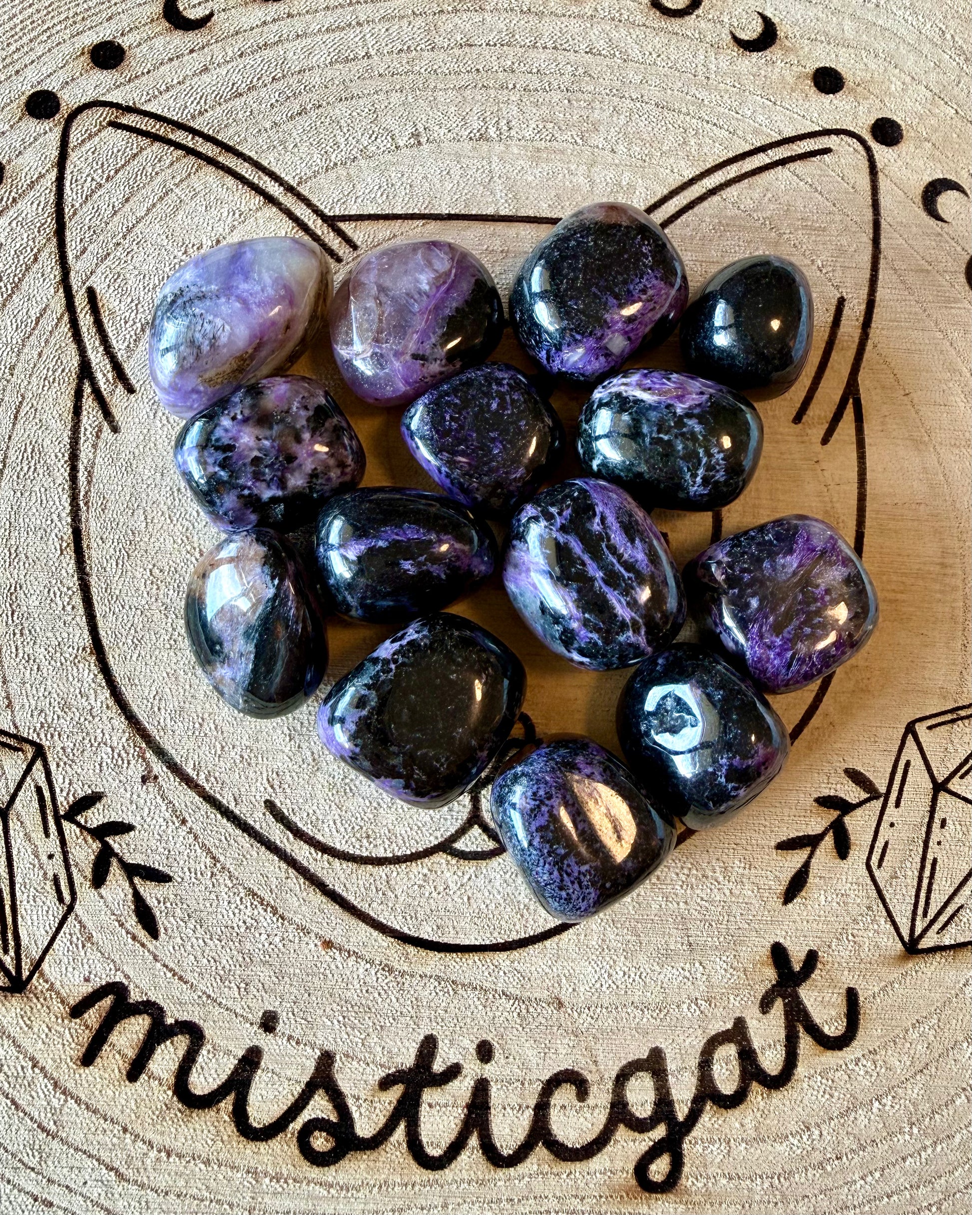 La Charoita es una piedra de transmutación y despertar espiritual. Su energía violeta irradia una frecuencia elevada capaz de transformar el miedo en amor, la confusión en claridad y el agotamiento en renovación del alma.