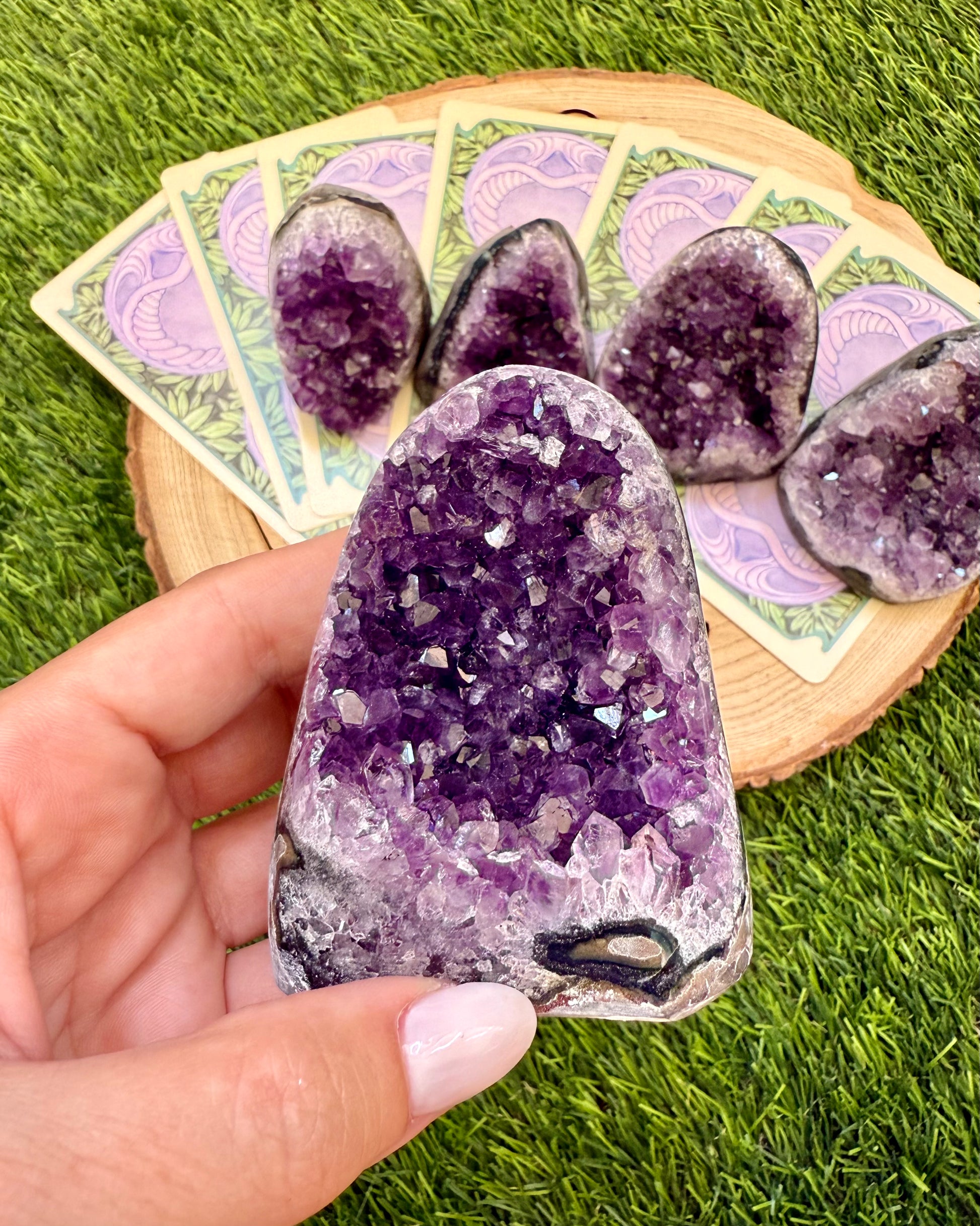 Estas poderosas drusas de amatista se sostienen en pie, convirtiéndose en piezas imponentes y armónicas para decorar tu altar, tu rincón sagrado o cualquier espacio que desees llenar de energía elevada. De buen tamaño y excelente calidad, cada una de ellas brilla con sus cristales bien definidos en tonos lilas y púrpuras profundos.