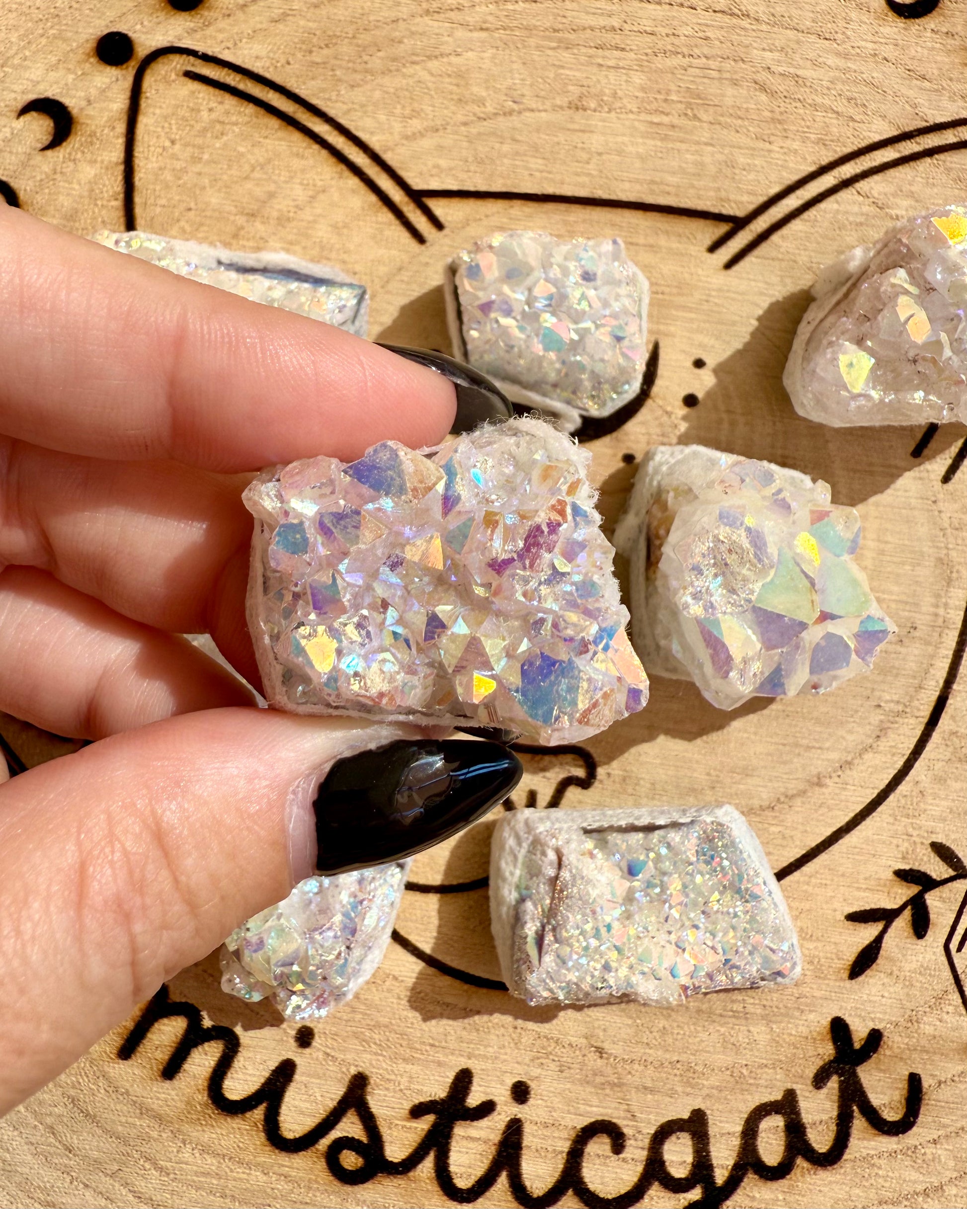 Pequeñas pero llenas de magia, estas drusas de Cuarzo Cristal Aura destacan por su excelente calidad y su brillo iridiscente único, como si concentraran en su interior un arcoíris de energía.