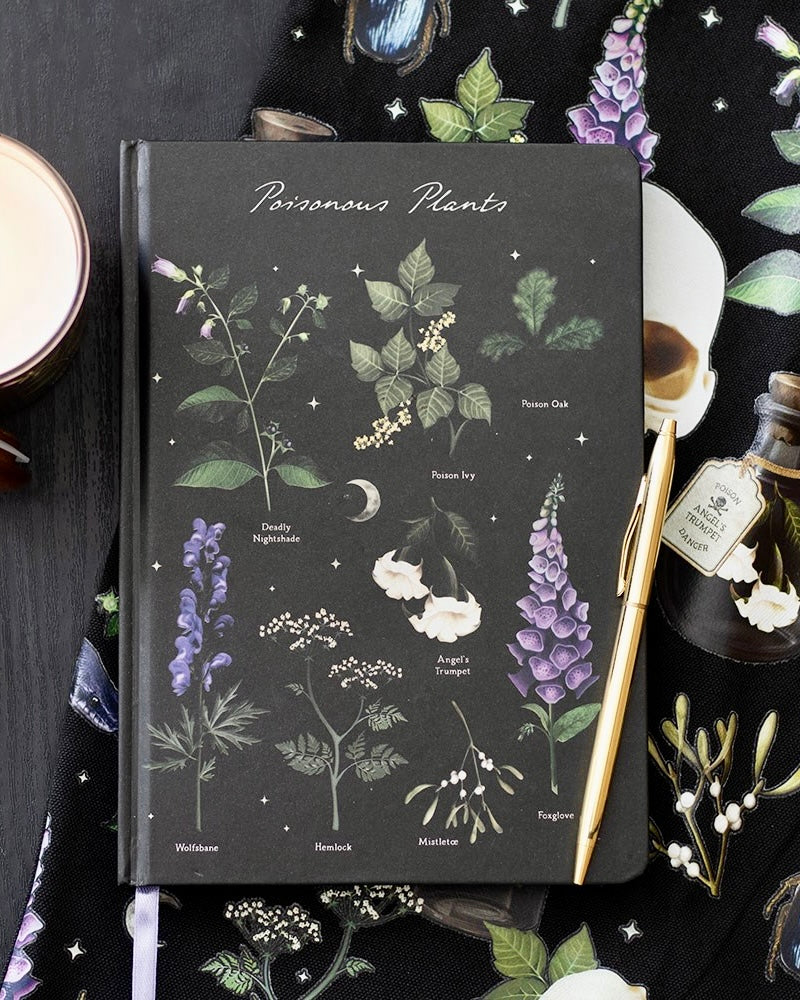 Tu herbario secreto en forma de libreta. Esta preciosa libreta A5 está decorada con un fascinante diseño de plantas venenosas, tan bello como enigmático. Cada trazo evoca la energía de la naturaleza salvaje y el misterio que habita en sus hojas.