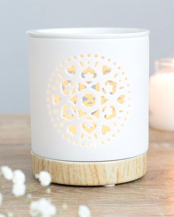 Un quemador blanco cerámico con un mandala troquelado que proyecta una luz suave y llena de intención. Su base con efecto madera aporta calidez y un toque natural, creando un equilibrio perfecto entre magia y serenidad. Añade tus ceras favoritas en la parte superior y deja que el aroma llene tu hogar mientras la luz del mandala transforma cualquier rincón en un espacio de paz y conexión.