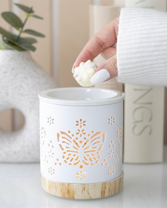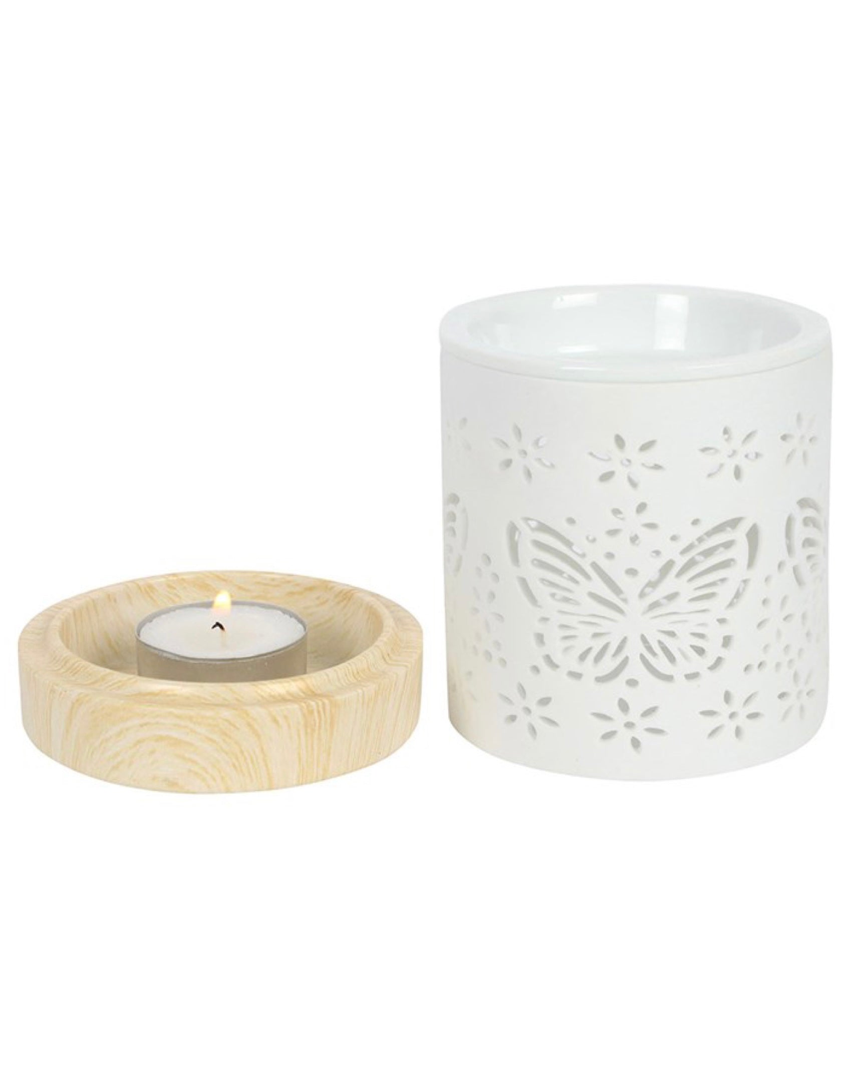 Un quemador cerámico blanco mate con una delicada mariposa troquelada que, al encender una vela en su interior, proyecta una luz cálida y preciosa. Su base con efecto madera aporta un toque natural y armónico, creando un equilibrio perfecto entre sencillez y magia. Añade tus ceras o aceites favoritos y deja que el aroma y la luz de la mariposa llenen tu espacio de calma, renovación y belleza.