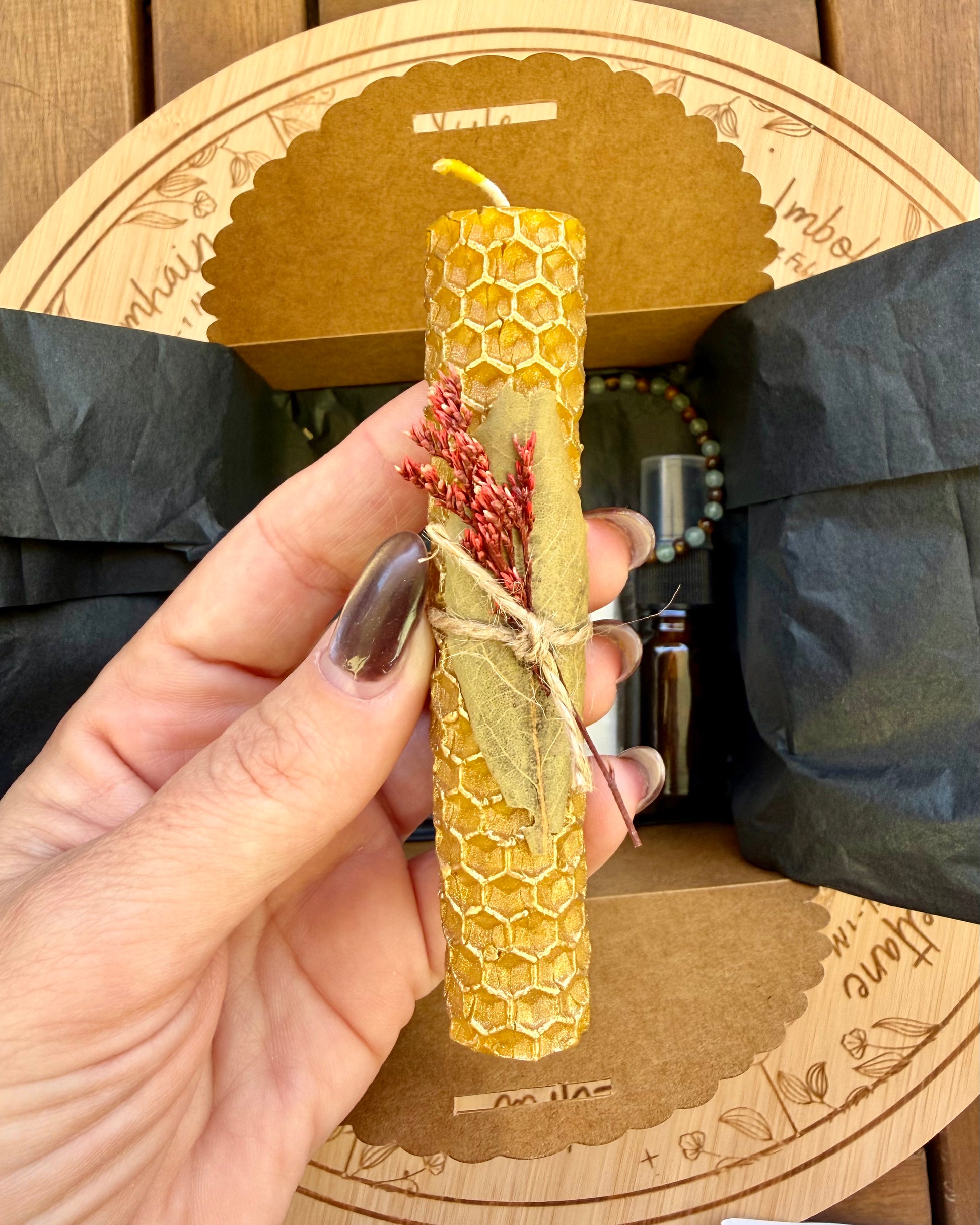 – Vela dorada de panal con laurel, símbolo de triunfo, claridad y apertura de caminos.
