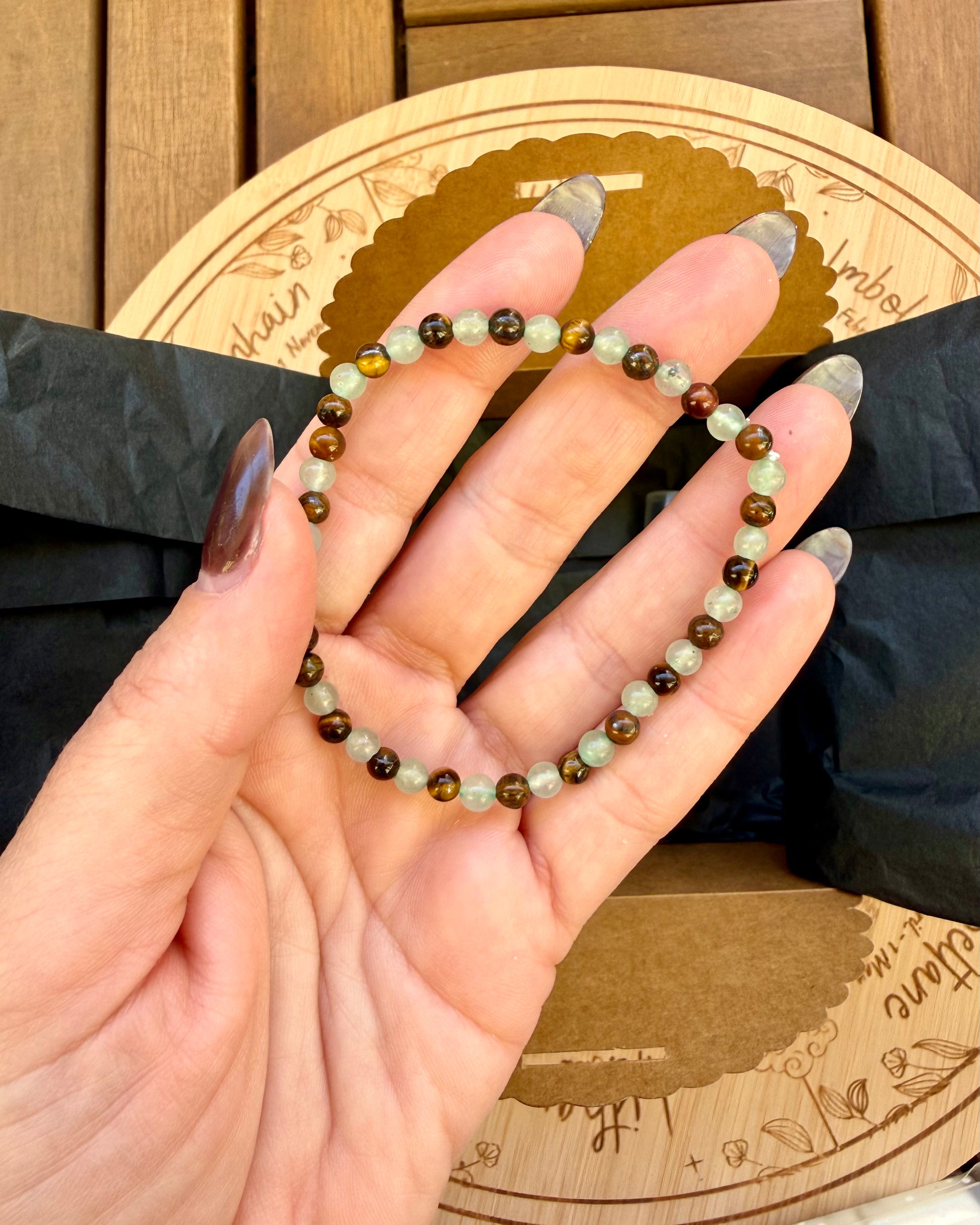 – Pulsera de aventurina y ojo de tigre como amuleto para el éxito, la buena fortuna y la confianza en ti misma.