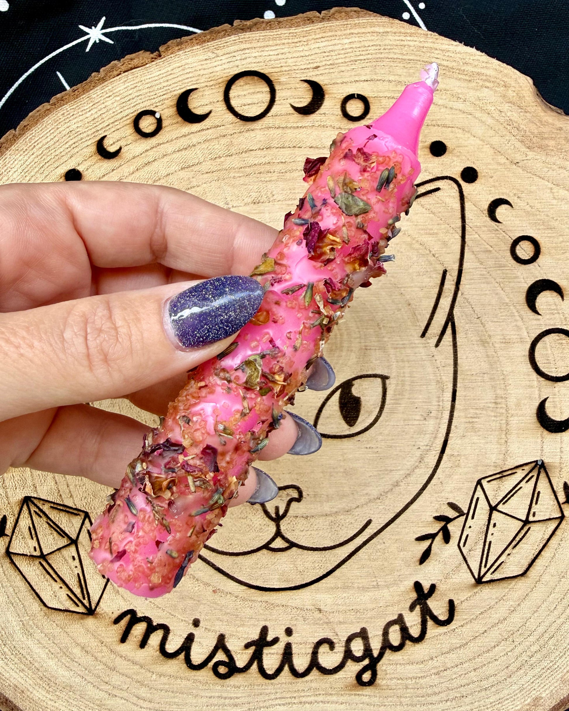 Hecha con amor, propósito y magia, esta vela rosa te acompaña en cada paso del viaje hacia tu propio bienestar y amor interior.