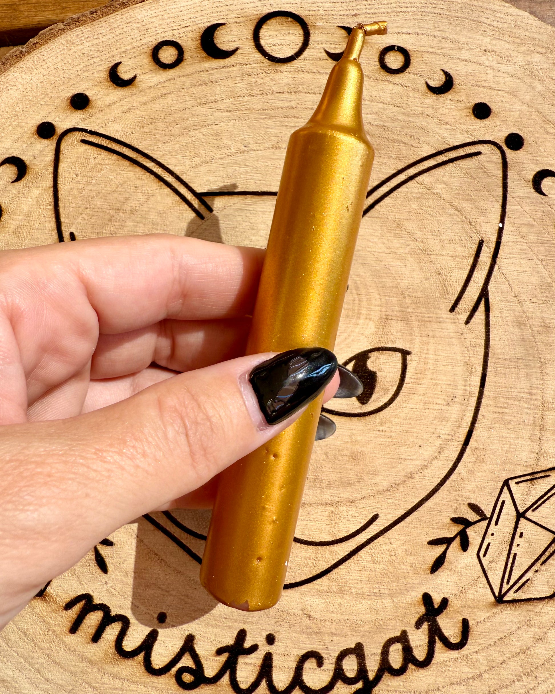 Vela artesanal de color oro, 12 cm de largo, de buena calidad, que quema de forma uniforme, con una duración aproximada de 3-4 horas.