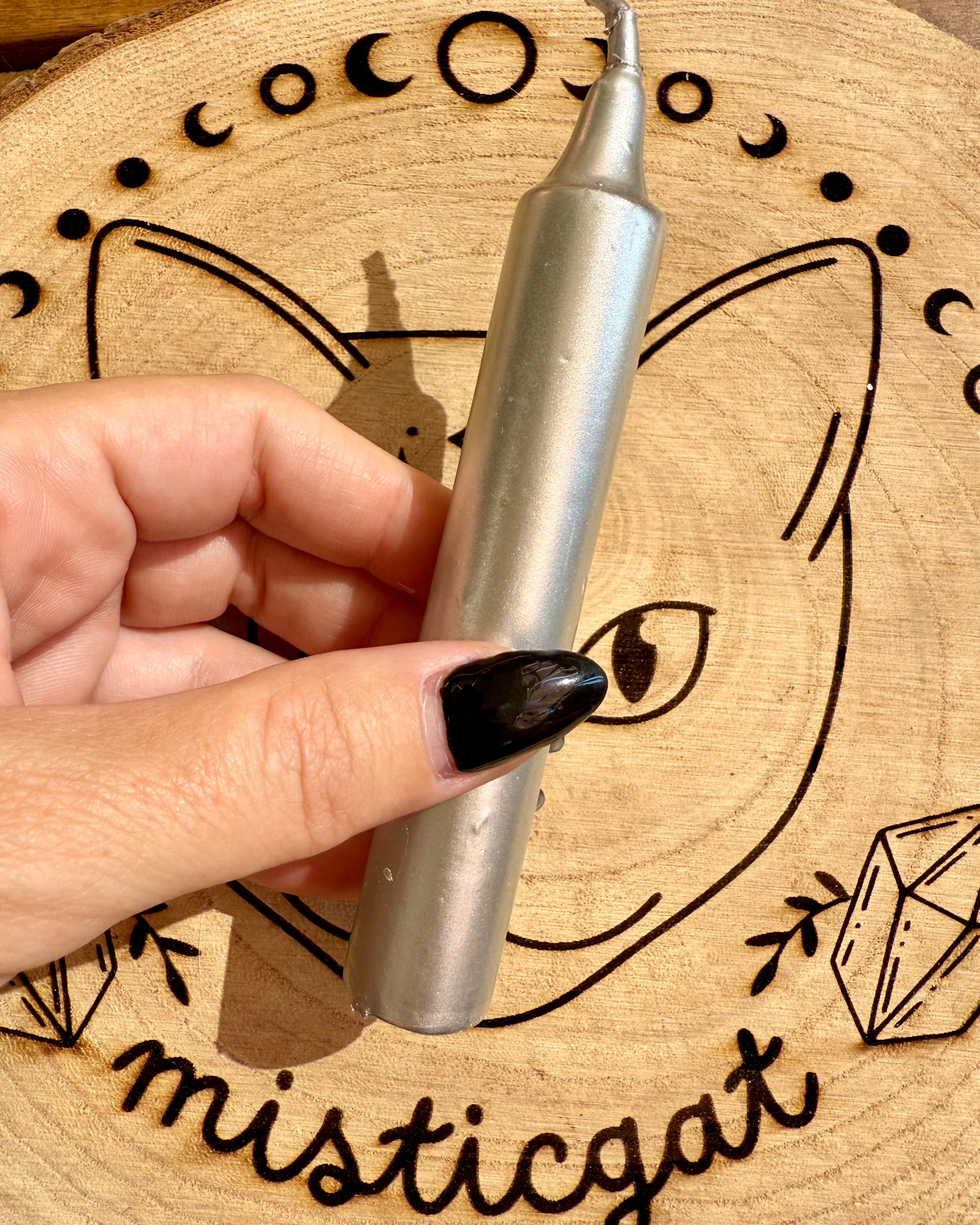 Vela artesanal de color plata, 12 cm de largo, de buena calidad, que quema de forma uniforme, con una duración aproximada de 3-4 horas.