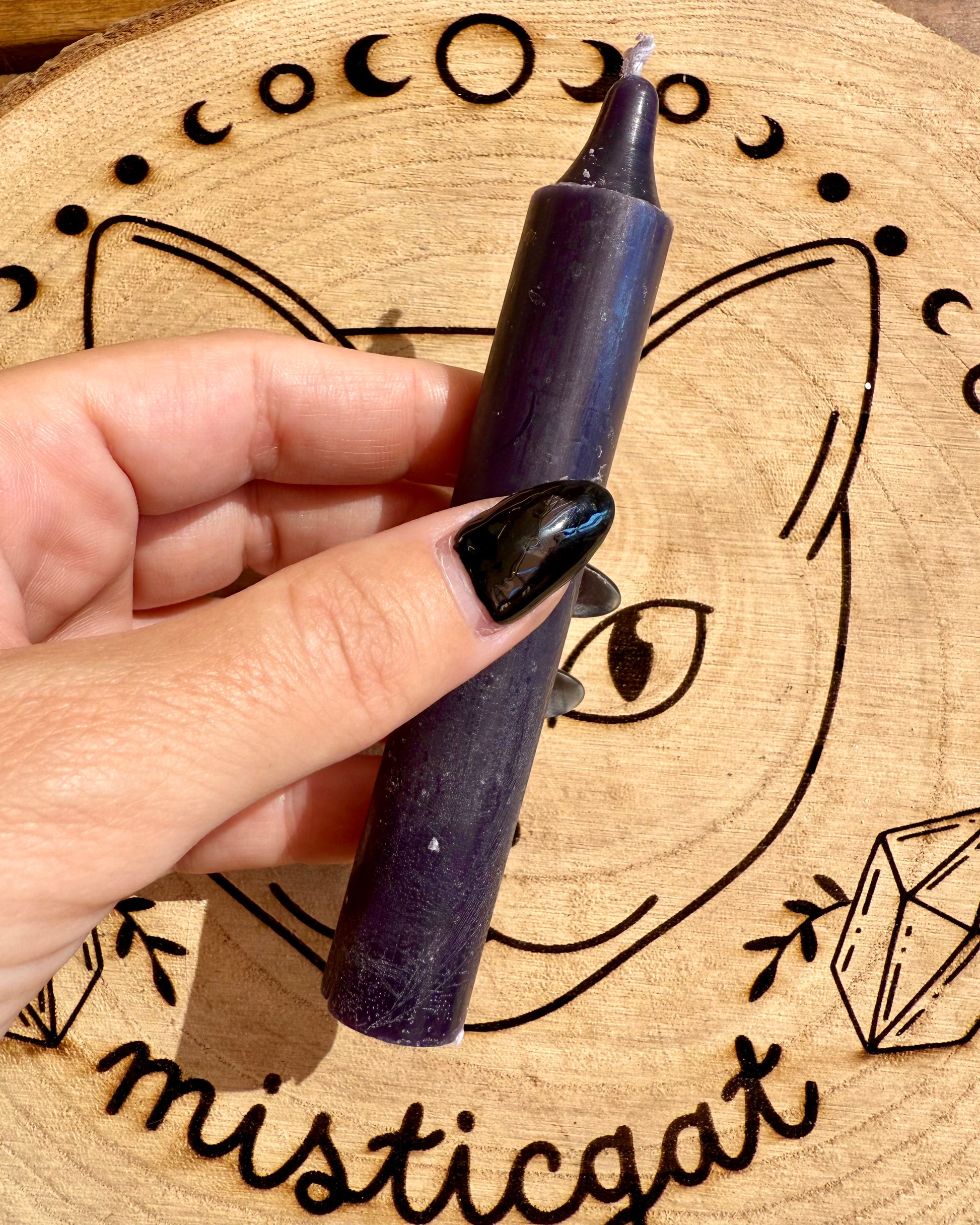 Vela artesanal de color negro de 12 cm de largo, de buena calidad, que quema de forma uniforme, con una duración aproximada de 3-4 horas.