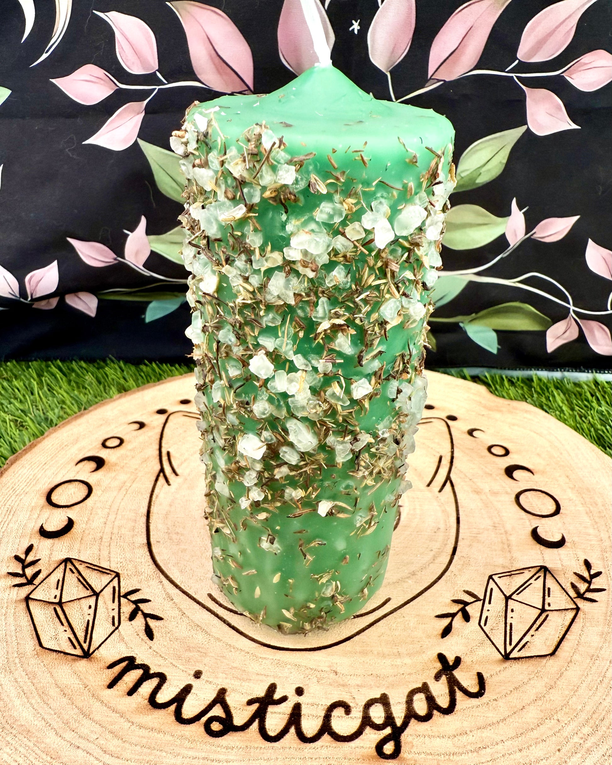 Velón artesanal de propósito, elaborado con sales y resinas protectoras, diseñado para actuar como un escudo energético frente a influencias dañinas y malas intenciones.