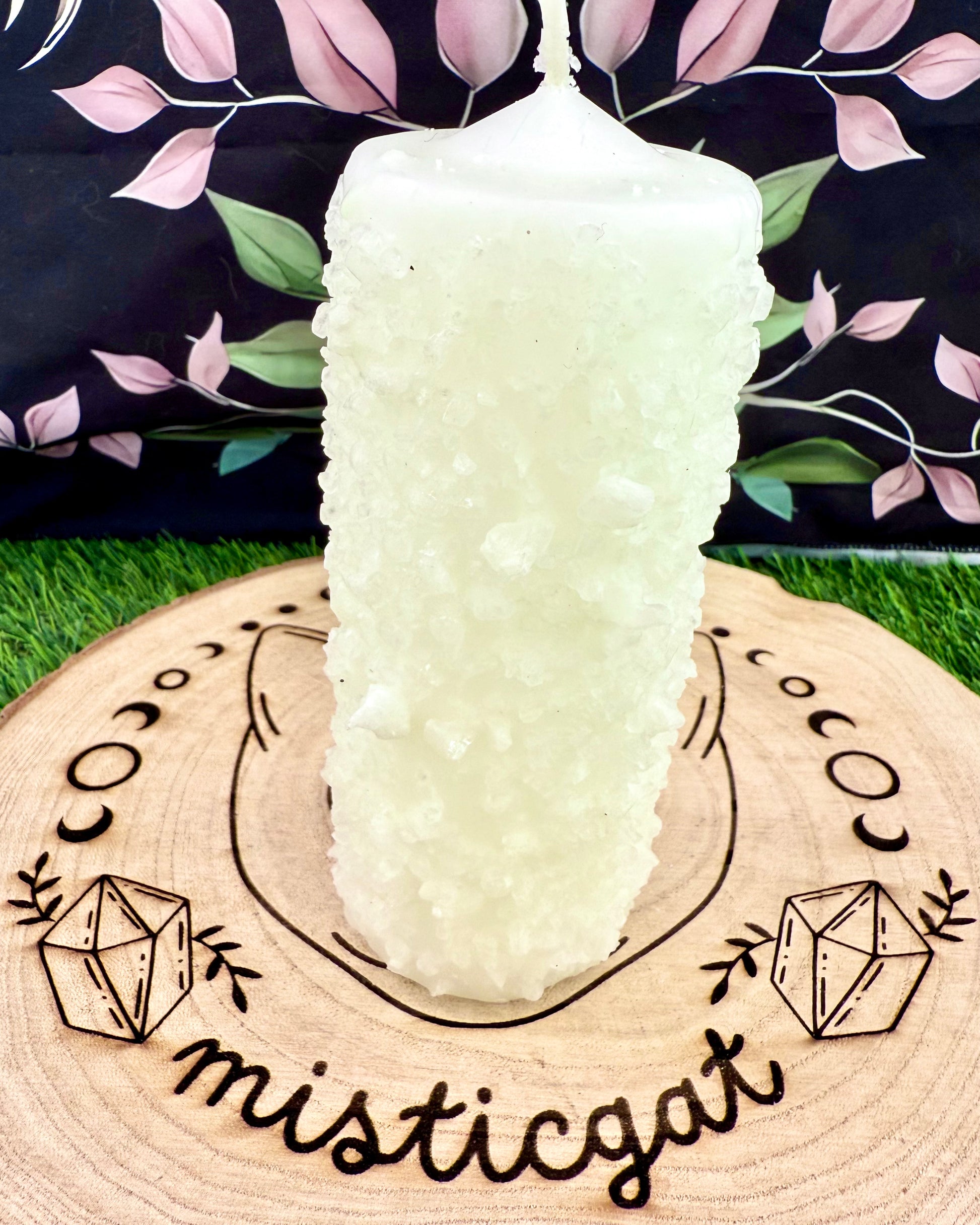 Velón artesanal de propósito, elaborado en color blanco y rebozado con sal purificadora, ideal para disolver energías negativas y devolver la armonía al cuerpo, la mente y el espíritu.