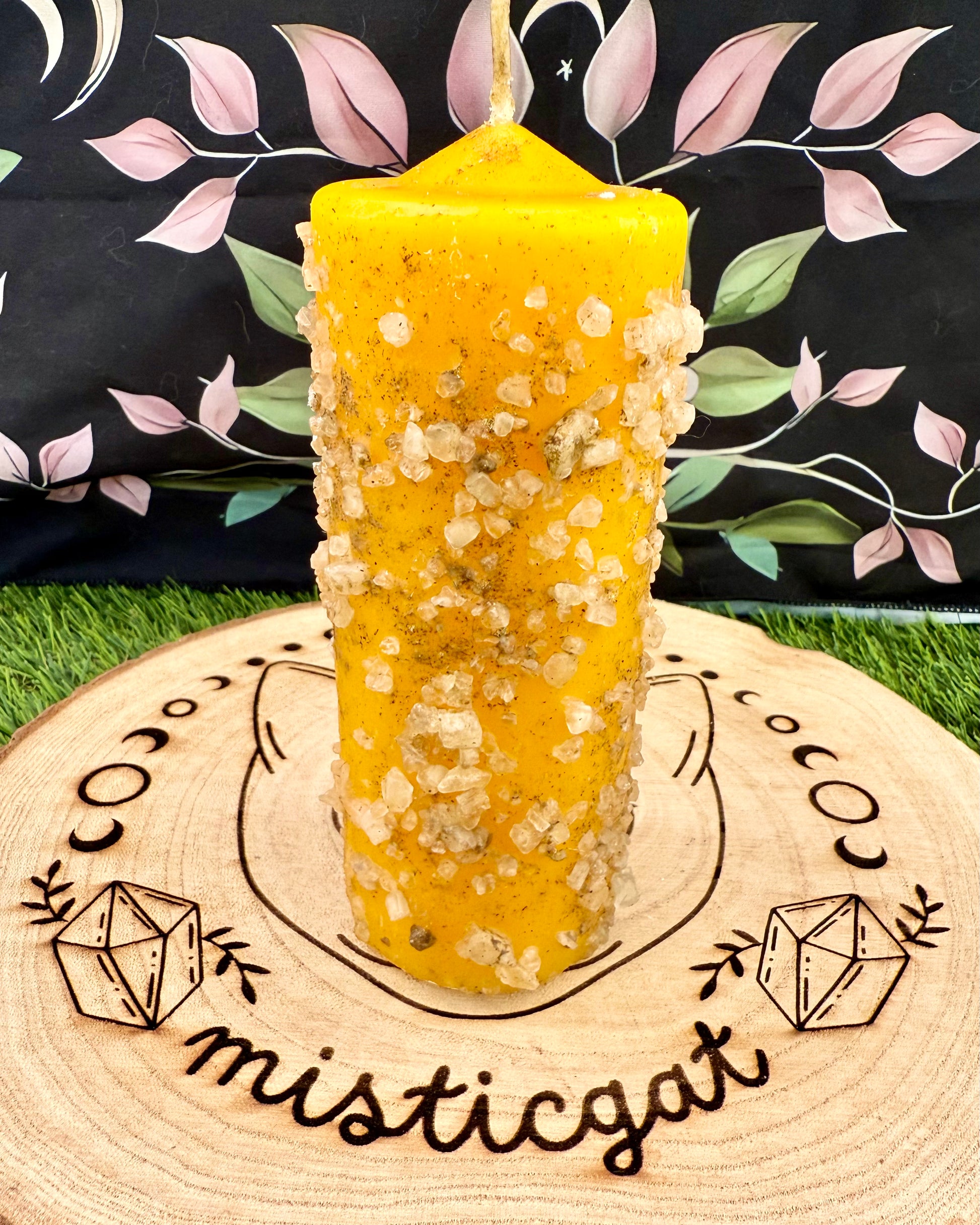 Velón artesanal de propósito, elaborado con hierbas naturales de ruda y rebozado con sal purificadora, una poderosa combinación para limpiar y proteger tus energías.