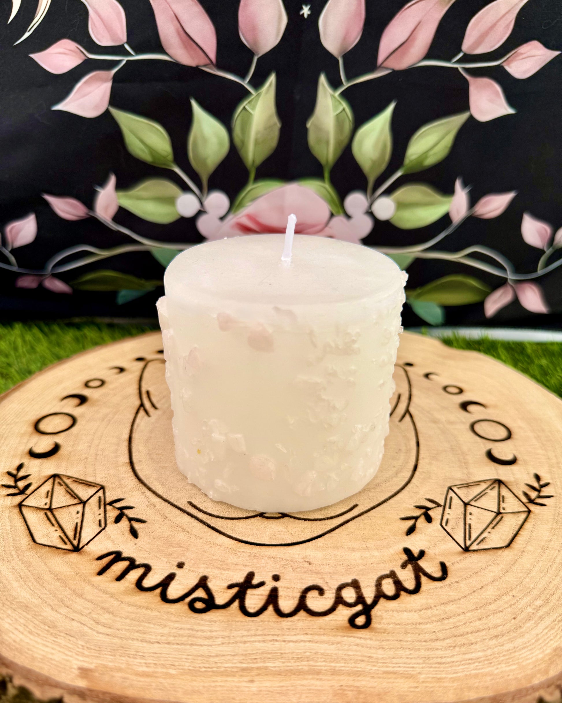 Veloncito artesanal de cera natural vestido con mineral natural de Cuarzo Rosa. Cada detalle de este velón potencia la armonía emocional y el amor en todas sus formas.